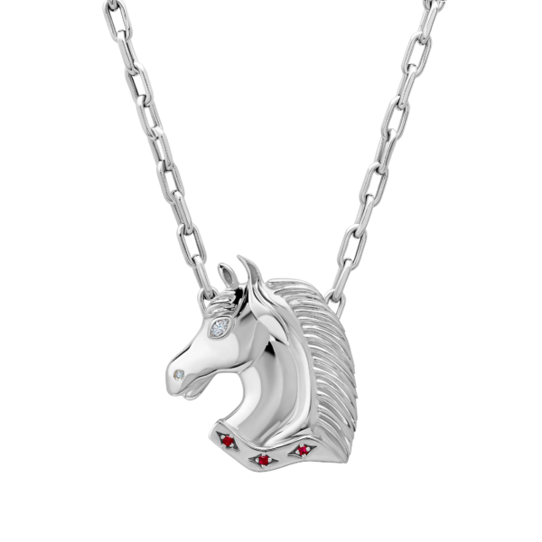 Crafted in 18k solid gold. the Arion Horse Necklace is a symbol of freedom and strength. A single marquise diamond eye reflects clarity and vision. while three rubies in an elongated diamond setting at the base of the neck embody passion. vitality. and endurance. a timeless talisman of grace. loyalty. and unbridled spirit. To wear it is to embody both the elegance of the horse’s spirit and the fire that drives it ever onward. serving as a reminder that you hold the power and endurance to pursue and reach your wildest dreams.