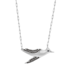 The Eos design captures the radiant energy of dawn through an elegant silver sparrow. symbolizing renewal. resilience and awakening. Crafted in 925 sterling silver. the necklace's silhouette is sleek and sculptural. its golden wings encrusted in black diamonds echoing the goddess Eos rising each morning to bring freedom. light and hope to the world.