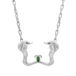 The Double Cobra Pendant hand carved in 925 sterling silver unites two serpents joined by a Tsavorite marquise with black diamond eyes. The divine eye. watching. guiding. and protecting. The Cobra has long been a symbol of guardianship and rebirth. This powerful serpent represents divine wisdom. royalty and protection against harm. When doubled they embody duality-masculine and feminine. power and grace. earth and spirit.